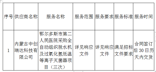 二、項(xiàng)目名稱:鄂爾多斯市第二人民醫(yī)院采購(gòu)全自動(dòng)組織脫水機(jī)及過(guò)氧化氫低溫等離子滅菌器項(xiàng)目(三次)