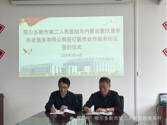 為深入貫徹黨的二十屆三中全會精神,落實國家衛(wèi)生健康委、民政部相關(guān)工作要求和自治區(qū)衛(wèi)生健康委、民政廳《關(guān)于深化醫(yī)療衛(wèi)生機構(gòu)和養(yǎng)老機構(gòu)協(xié)議合作的通知》,進一步深化醫(yī)療衛(wèi)生機構(gòu)和養(yǎng)老機構(gòu)協(xié)議合作,加強服務(wù)供需對接,為老年人提供優(yōu)質(zhì)高效的醫(yī)養(yǎng)結(jié)合服務(wù)。2025年3月14日,鄂爾多斯市第二人民醫(yī)院與內(nèi)蒙古蒙欣康養(yǎng)養(yǎng)老服務(wù)有限公司醫(yī)養(yǎng)合作服務(wù)協(xié)議簽約儀式在市第二人民醫(yī)院空港部舉行。此次合作按照“平等自愿、就近就便、服務(wù)銜接、共謀發(fā)展”的原則,以“醫(yī)養(yǎng)融合、資源共享、服務(wù)民生”為核心為老年群體提供全方位、多層次的健康養(yǎng)老服務(wù)。