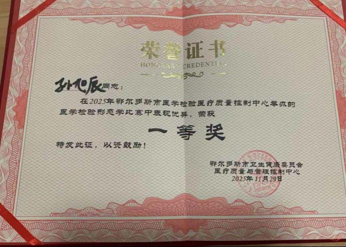 我院醫(yī)學(xué)檢驗(yàn)科孫旭辰同志代表醫(yī)院參賽,憑借扎實(shí)的理論基礎(chǔ)、敏銳的判斷能力和穩(wěn)定的現(xiàn)場(chǎng)發(fā)揮,在比賽中脫穎而出,榮獲形態(tài)學(xué)識(shí)別競(jìng)賽一等獎(jiǎng)。此次比賽以賽促學(xué)、以賽驗(yàn)學(xué),充分展現(xiàn)了我院醫(yī)學(xué)檢驗(yàn)人員過(guò)硬的專業(yè)素質(zhì)和積極進(jìn)取的精神風(fēng)貌。市二醫(yī)院全體干部職工以孫旭辰同志為榜樣,學(xué)習(xí)其鉆研業(yè)務(wù)、精益求精的專業(yè)精神,積極提升自身技能水平。